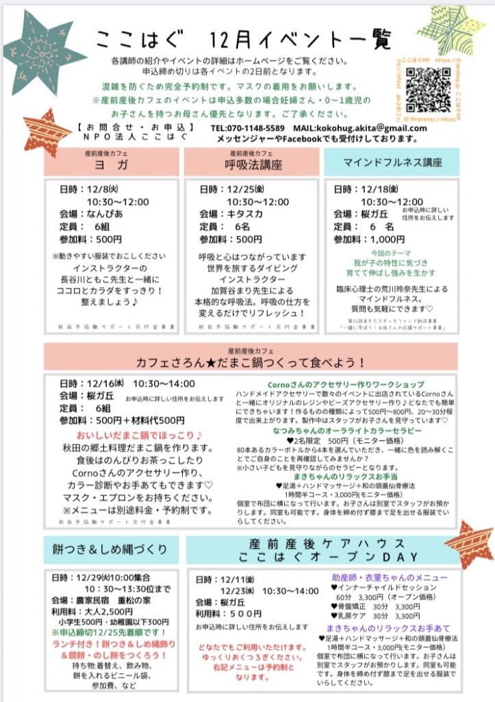 ここはぐ12月イベント 2020 12/01 2020.11.27 2020.12.01 イベントお知らせ 11/25 姿勢を良くする体操 「エゴスキュー」 12/8 産前産後カフェ —ヨガday— この記事を書いた人 ここはぐ 関連記事 10月のちくちく会開催のお知らせ 2020.10.10 2/9 ここはぐマタニティクラス 2021.01.14 11月スケジュール 2022.11.16 ここはぐ9月イベント 2021.08.18 2月のスケジュール 2023.01.25 3月のスケジュールです 2022.02.25 6月のスケジュール 2024.05.22 1/29 産前産後カフェ 『だっこと発達』 2021.01.14 コメント コメントする コメントをキャンセルコメント ※ 名前 ※ メール ※ サイト 次回のコメントで使用するためブラウザーに自分の名前、メールアドレス、サイトを保存する。