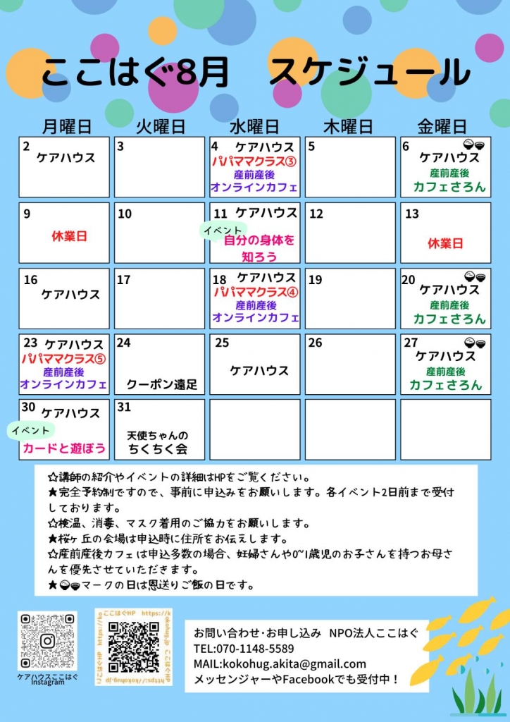 ここはぐ8月イベント 2021 7/19 2021.07.19 2021.07.19 ここはぐ8月イベント お申込みお待ちしてます 8月20日はケアハウス・産前産後カフェはお休みとさせていただきます。 お知らせ 5月ここはぐイベントカレンダー パパ・ママクラスやっています この記事を書いた人 ここはぐ 関連記事 1/19 さろんday 『大人のための読み聞かせ』 2021.01.14 令和6年度 わんぱくキッズのおでかけプラン 2024.04.16 12/22 ここはぐマタニティクラス お産編 2020.12.01 姿勢を良くする体操 「エゴスキュー」 2020.10.06 12/11 & 12/23 ここはぐオープンday 2020.12.01 3月のスケジュールです 2022.02.25 パパ・ママクラスやっています 2021.07.29 \活動報告/ 10月おもちゃ図書館 2020.11.03 コメント コメントする コメントをキャンセルコメント ※ 名前 ※ メール ※ サイト 次回のコメントで使用するためブラウザーに自分の名前、メールアドレス、サイトを保存する。