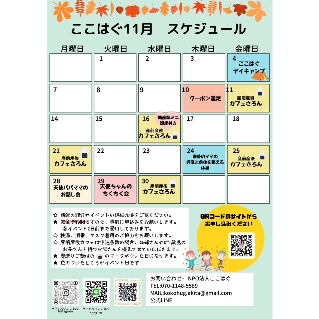11月スケジュール 2022 11/16 2022.11.16 2022.11.16 大変遅くなりました。11月のスケジュールになります。 イベントが終了してしまったものもありますが、まだ受付可能なイベントもあります。 ご参加お待ちしています。 11月スケジュール イベント 9月のスケジュール 2月のスケジュール この記事を書いた人 ここはぐ 関連記事 11/20マインドフルネス講座 \アドラー心理学を学ぼう/ 2020.11.03 11/17 カフェさろんday 2020.10.27 12/18 マインドフルネス講座 《我が子の特性に気づき育てて伸ばし強みを生かす》 2020.12.01 12/22 ここはぐマタニティクラス お産編 2020.12.01 姿勢を良くする体操 「エゴスキュー」 2020.10.06 12/8 産前産後カフェ —ヨガday— 2020.12.01 お話会&座談会 『産前産後のからだのはなし&しあわせなおっぱい生活 2020.03.01 日曜開催‼ここはぐマタニティクラスのお知らせ 2021.10.20 コメント コメントする コメントをキャンセルコメント ※ 名前 ※ メール ※ サイト 次回のコメントで使用するためブラウザーに自分の名前、メールアドレス、サイトを保存する。