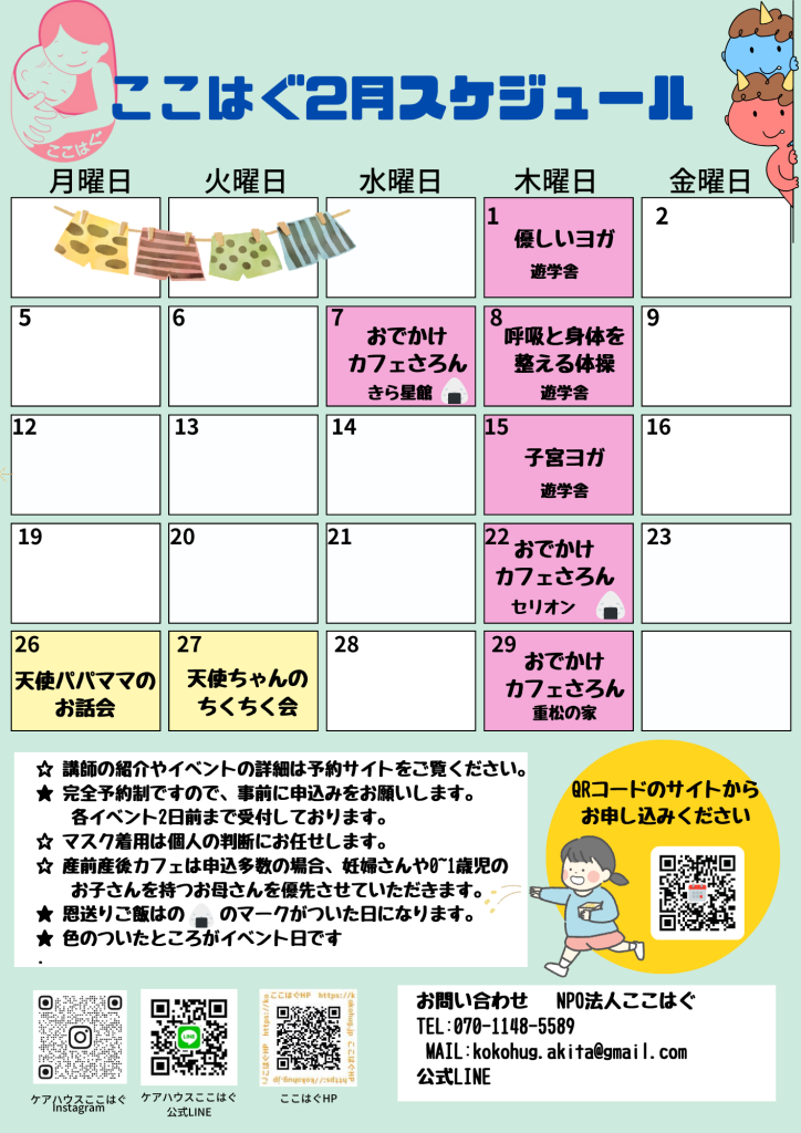 2月スケジュールです 2024 1/22 2024.01.22 2024.01.22 2月のスケジュールになります。 今年は雪も少なく過ごしやすいですね。 カフェさろんほか、体操もありますのでぜひ遊びに来てください。 予約フォームよりご予約お待ちしています。 イベントお知らせちくちく会産前・産後カフェ産前産後ケアハウスここはぐ 2024年1月スケジュールです 3月スケジュールです この記事を書いた人 ここはぐ 関連記事 3/9 & 3/31 天使ちゃんのちくちく会 2020.03.01 \活動報告/ 10月おもちゃ図書館 2020.11.03 12/16 ここはぐカフェさろんday 《一緒にだまこ鍋を作って食べよう!》 2020.12.01 12/8 産前産後カフェ —ヨガday— 2020.12.01 ここはぐ11月 イベント 2021.11.05 11/20マインドフルネス講座 \アドラー心理学を学ぼう/ 2020.11.03 ここはぐ研修会開催のご案内 2024.12.27 8/24 産前産後カフェ『こどものデリケートゾーンケア』 2020.07.29 コメント コメントする コメントをキャンセルコメント ※ 名前 ※ メール ※ サイト 次回のコメントで使用するためブラウザーに自分の名前、メールアドレス、サイトを保存する。