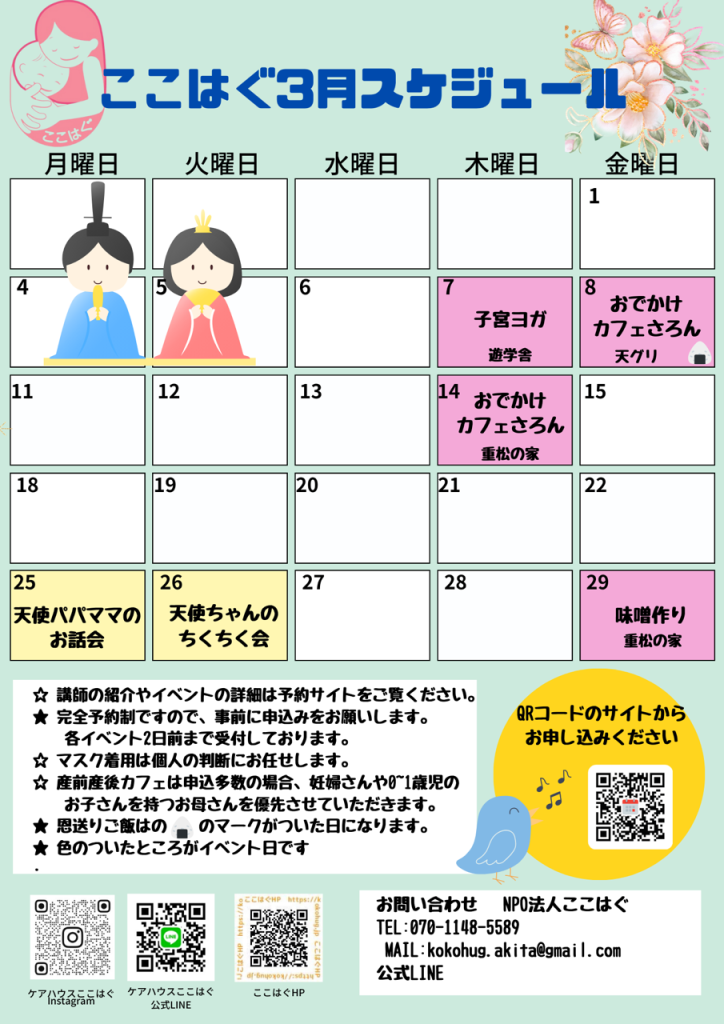 3月スケジュールです 2024 2/28 2024.02.28 2024.02.28 3月のスケジュールになります。 まだ寒い日もありますが楽しんでいきましょう。 2/29より延期になったみそたんぽとだまこ作りは追加で5組の募集がありますので、予定の合う方ぜひご参加ください。 当日のキャンセルや連絡に関してはお電話でお願いします。 イベントお知らせお話し会ちくちく会産前・産後カフェ 2月スケジュールです 令和6年度 わんぱくキッズのおでかけプラン この記事を書いた人 ここはぐ 関連記事 お話会&座談会 『産前産後のからだのはなし&しあわせなおっぱい生活 2020.03.01 \6/9産前産後カフェ/ 助産師さんとお茶っこしよう^_^ 2020.06.04 11月スケジュール 2022.11.16 ここはぐ12月 イベント 2021.12.02 パパ・ママクラスやっています 2021.07.29 2月ここはぐイベント 2021.02.05 令和4年度 わんぱくキッズのおでかけプラン 2022.04.12 5月ここはぐイベントカレンダー 2021.04.28 コメント コメントする コメントをキャンセルコメント ※ 名前 ※ メール ※ サイト 次回のコメントで使用するためブラウザーに自分の名前、メールアドレス、サイトを保存する。